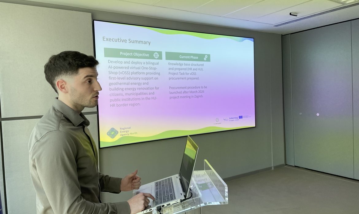 Ilija Beljan, Mlađi voditelj projekata u REA Sjever predstavio je trenutni status razvoja dvojezične virtualne platforme One-Stop-Shop (vOSS) temeljene na umjetnoj inteligenciji, koja pruža početnu savjetodavnu podršku u području geotermalne energije i energetske obnove zgrada za građane, jedinice lokalne samouprave i javne institucije na području pograničnih regija Hrvatske i Mađarske.